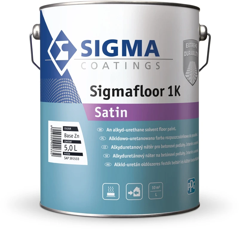 Sigmafloor 1K to jednokomponentowa farba alkidowo-uretanowa do posadzek betonowych i ścian o niskim obciążeniu użytkowym. Produkt przeznaczony jest do ochrony oraz dekoracji podłóg i ścian. Farba poprawia estetykę i ułatwia utrzymanie posadzki w czystości. Farbę można nakładać także na podłoża pionowe (np. lamperie). Może być stosowany w pomieszczeniach takich, jak hale przemysłowe magazyny, garaże, piwnice, schody itp. Nadaje się zarówno do nowych budynków, jak i wykonywania renowacji na istniejących, dobrze związanych z podłożem powłokach.
